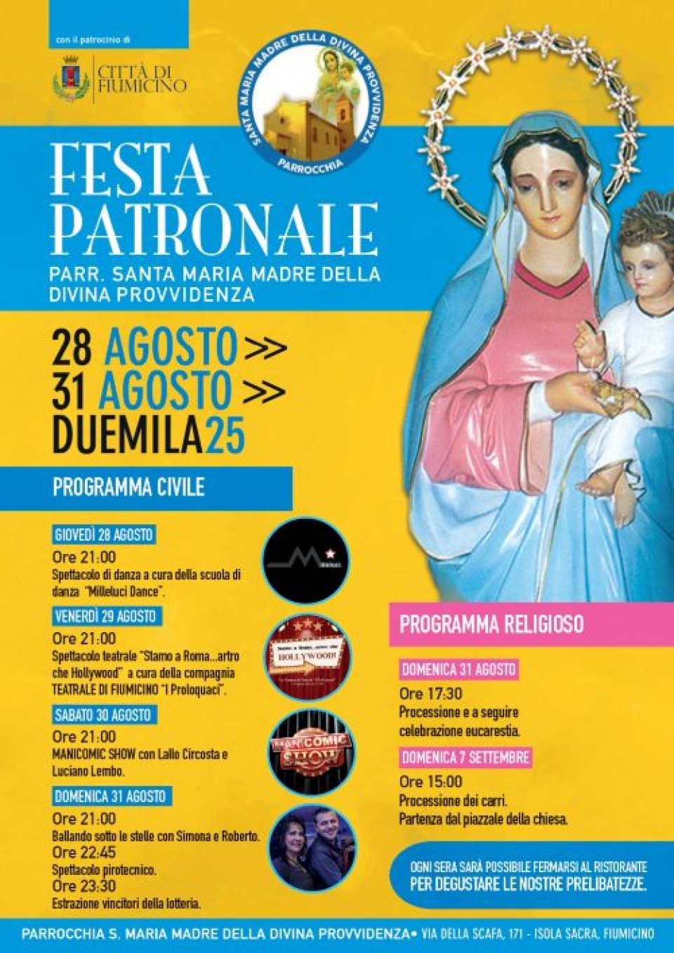 Fiumicino (Rm) – Prende il via giovedì 28 agosto la tradizionale Festa della Parrocchia Santa Maria Madre della Divina Provvidenza, patrona di Isola Sacra, dei contadini e del grano.