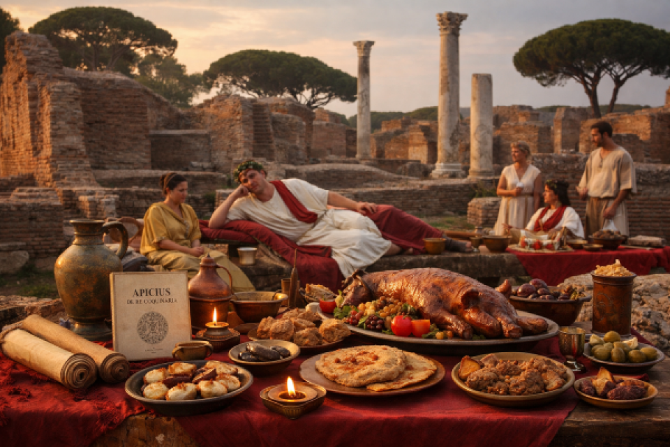 Alla narrazione storica si affianca la degustazione di ricette ispirate ad Apicio, autore del I secolo d.C. e massimo riferimento della gastronomia romana antica. Spezie, contrasti di sapori, preparazioni elaborate restituiscono l’idea di una cucina sorprendentemente sofisticata, lontana dagli stereotipi e profondamente legata al contesto culturale dell’epoca.