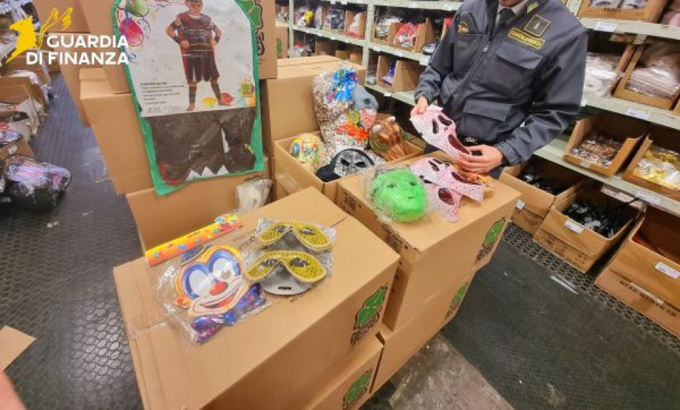 All’interno di un locale sono stati sequestrati oltre 28.000 prodotti, tra maschere di Carnevale, accessori, cosmetici e apparecchiature elettroniche.