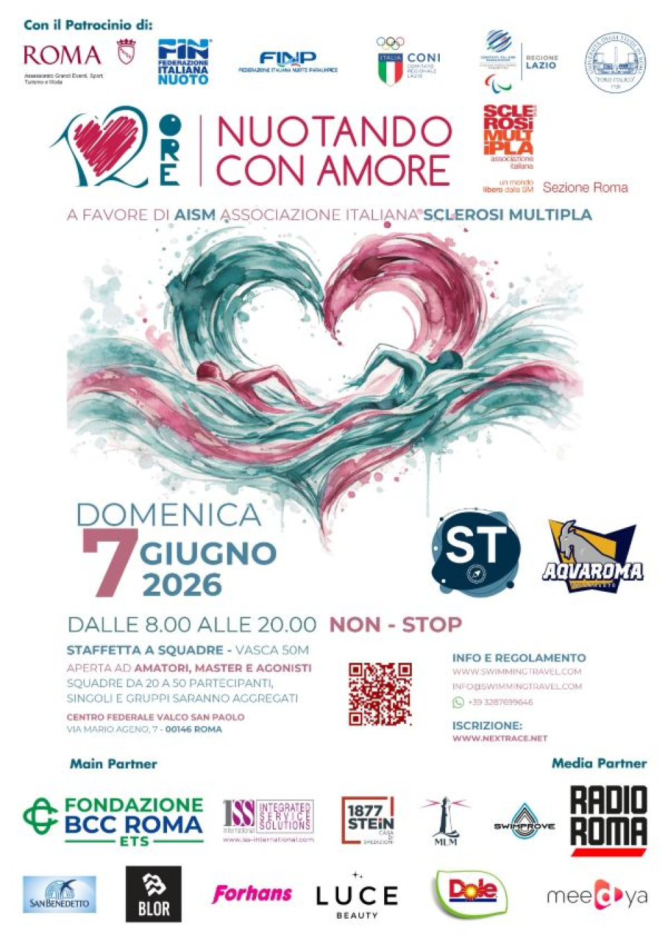 A precedere l’evento, giovedì 21 maggio alle ore 17.30 si terrà la presentazione ufficiale della “12 Ore Nuotando con AmOre per AISM” presso l’Università degli Studi di Roma “Foro Italico”, in Piazza Lauro De Bosis 4, nella Sala Consiliare Giulio Marinozzi. Un momento di incontro e condivisione aperto a istituzioni, partner, stampa e sostenitori, che offrirà l’occasione per approfondire i valori, gli obiettivi e le novità dell’edizione 2026 della manifestazione.