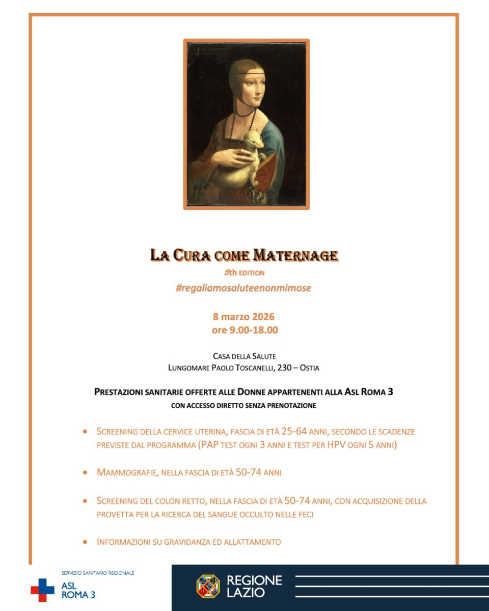 “Anche quest'anno la Asl Roma 3 trasforma la Festa della Donna da sterile celebrazione in servizio sanitario, offrendo test di screening gratuiti e senza prenotazione. ‘La cura come maternage’ intende così ribadire l'importanza di prendersi cura della propria salute grazie alla prevenzione, che resta lo strumento sanitario più potente ed efficace che abbiamo a disposizione per stare bene”, ha concluso Maria Rita Noviello, Dirigente Responsabile degli Screening Oncologici Asl Roma 3.