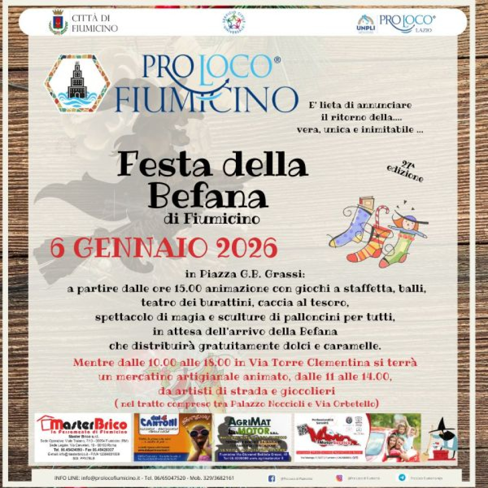 Fiumicino (Rm) - La Befana torna a far sorridere grandi e piccoli a Fiumicino. Una festa antica che unisce generazioni. Martedì 6 gennaio, in occasione dell’Epifania, piazza G.B. Grassi si trasformerà in un grande spazio di festa, colori e allegria grazie all’iniziativa promossa dalla Pro Loco di Fiumicino con il patrocinio del Comune. Un appuntamento atteso, che rinnova una tradizione profondamente radicata nella cultura popolare italiana e che ogni anno richiama famiglie, bambini e visitatori.