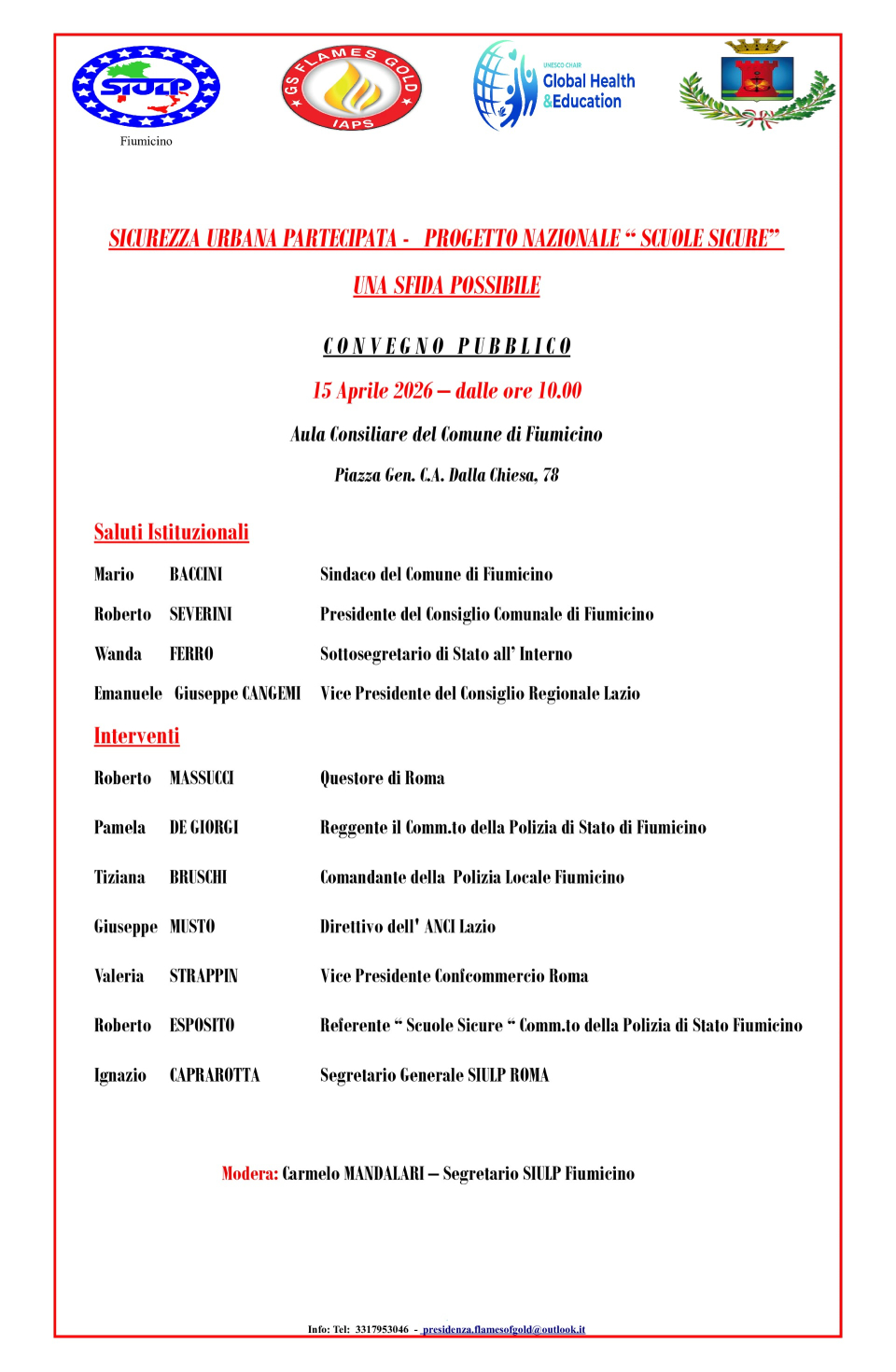 A moderare l’incontro sarà il segretario SIULP di Fiumicino Carmelo Mandalari, mentre tra i partecipanti sono attesi il sindaco Mario Baccini e il questore di Roma Roberto Massucci, insieme ad altre figure istituzionali.
