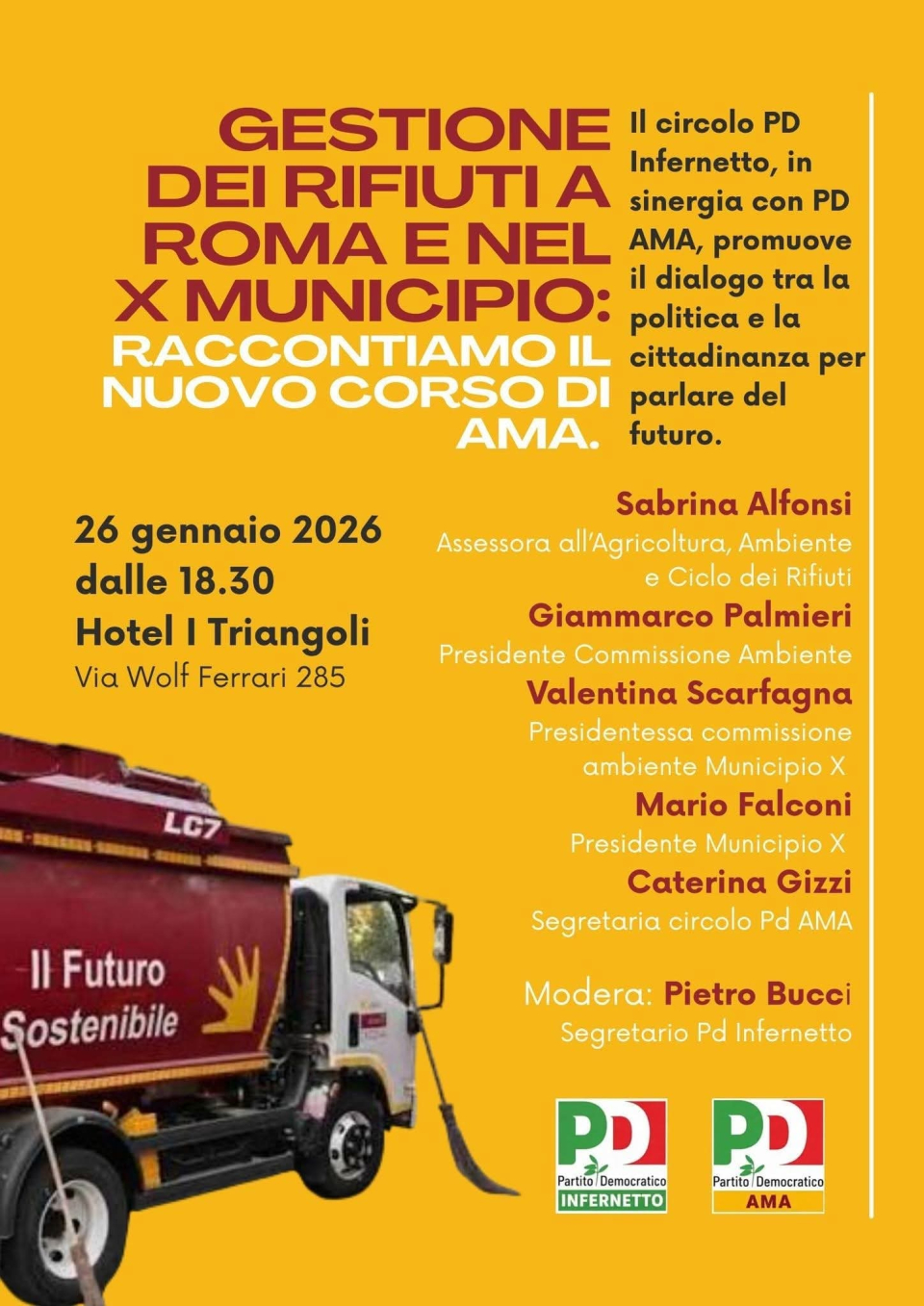 Infernetto (Rm) – I rifiuti non sono solo un problema da risolvere, ma una sfida decisiva per il presente e il futuro di Roma. Da questa consapevolezza nasce l’incontro pubblico promosso dal Circolo PD Infernetto in collaborazione con Ama, in programma lunedì 26 gennaio, alle 18.30.