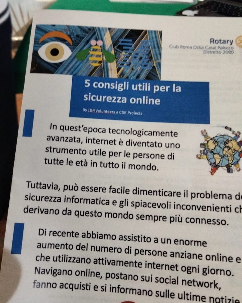 Il progetto rientra nelle attività di responsabilità sociale d’impresa di IBM ed è stato portato dal Rotary Club 'Roma Ostia Casal Palocco' nei centri anziani del decimo municipio: un'iniziativa ideata dalla Presidente Donatella Carriera, dalla vicepresidente della Commissione Progetti, Caterina Raganella, e dal Prefetto Imma Santovito, che ha visto il supporto di due volontarie IBM, Antonella Bichi e la stessa Imma Santovito, impegnate direttamente nel trasferire competenze digitali ai partecipanti attraverso esercizi pratici, esempi reali e procedure operative semplici.