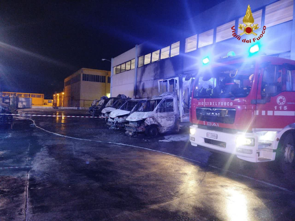 Per cause ancora in fase di accertamento, l’incendio ha avvolto i mezzi parcheggiati nel piazzale dell’azienda: sei furgoni sono andati completamente distrutti, mentre altri tre hanno riportato danni parziali. Il calore sprigionato dal rogo ha interessato anche parte della struttura aziendale, provocando ulteriori danni materiali.