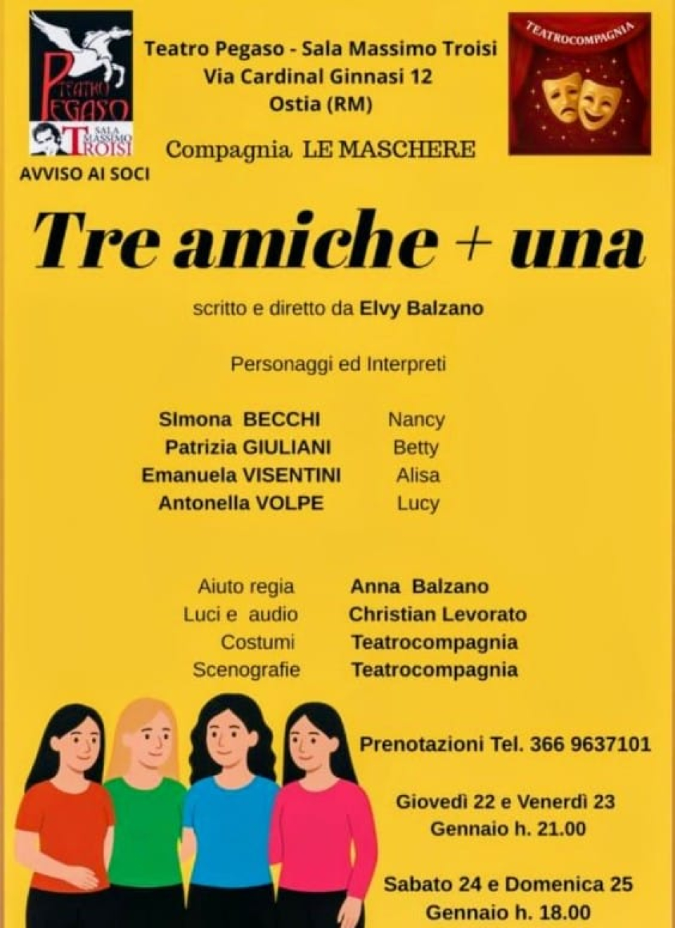 Ostia (Rm) – Un’amicizia che nasce, si interrompe, si trasforma e poi si ritrova. E' questo il cuore pulsante di “Tre Amiche + Una”, la pièce scritta e diretta da Elvy Balzano, in scena dal 22 al 25 gennaio al Teatro Pegaso di Ostia, nella Sala Massimo Troisi di via Cardinal Ginnasi.