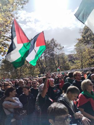 Ostia (Rm) – Le bandiere sventolano nonostante la pioggia sottile che bagna il Lido di Ostia. Una lunga scia di bandiere, striscioni e tamburi attraversa le vie del centro: centinaia di persone, soprattutto giovani, hanno partecipato nella mattinata di domenica 5 ottobre al corteo per la Palestina, promosso dai collettivi giovanili e da Ostia Antifascista, poi uniti.