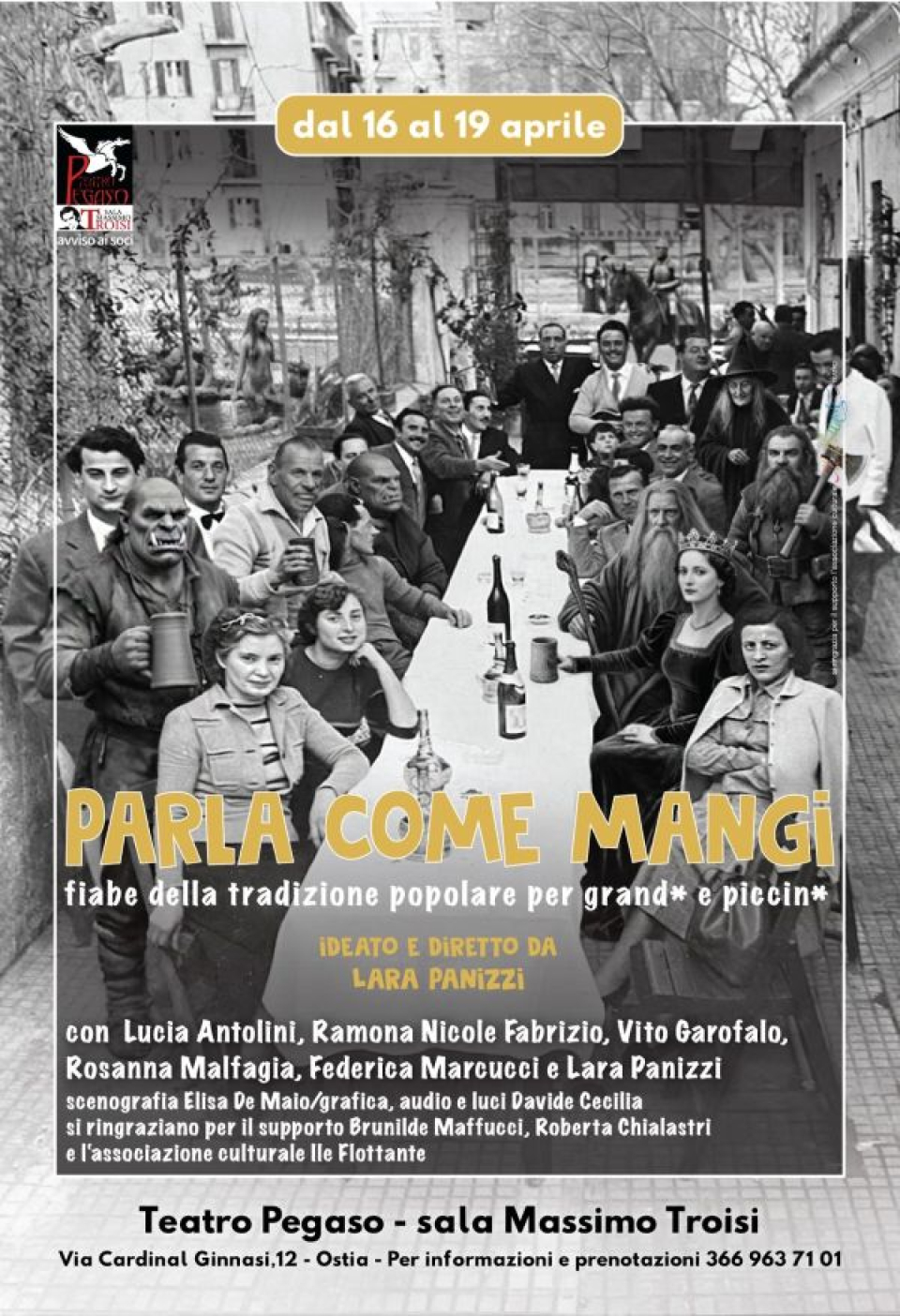“Parla come Mangi” è ideato e diretto da Lara Panizzi e vede in scena un cast corale composto da Lucia Antolini, Ramona Nicole Fabrizio, Vito Garofalo, Rosanna Malfagia, Federica Marcucci e la stessa Panizzi.