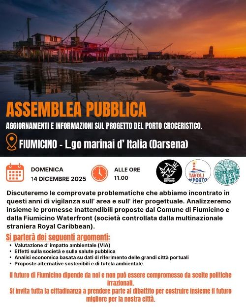 L’incontro, organizzato dal comitato Tavoli del Porto in collaborazione con il Collettivo No Porto e l’associazione Scienza Radicata, ha l’obiettivo di aggiornare la cittadinanza sull’evoluzione dell’iter progettuale, sulle criticità emerse e sulle posizioni espresse negli ultimi mesi dall’Amministrazione comunale e dalla Fiumicino Waterfront, società controllata dalla multinazionale Royal Caribbean, promotrice dell’opera.