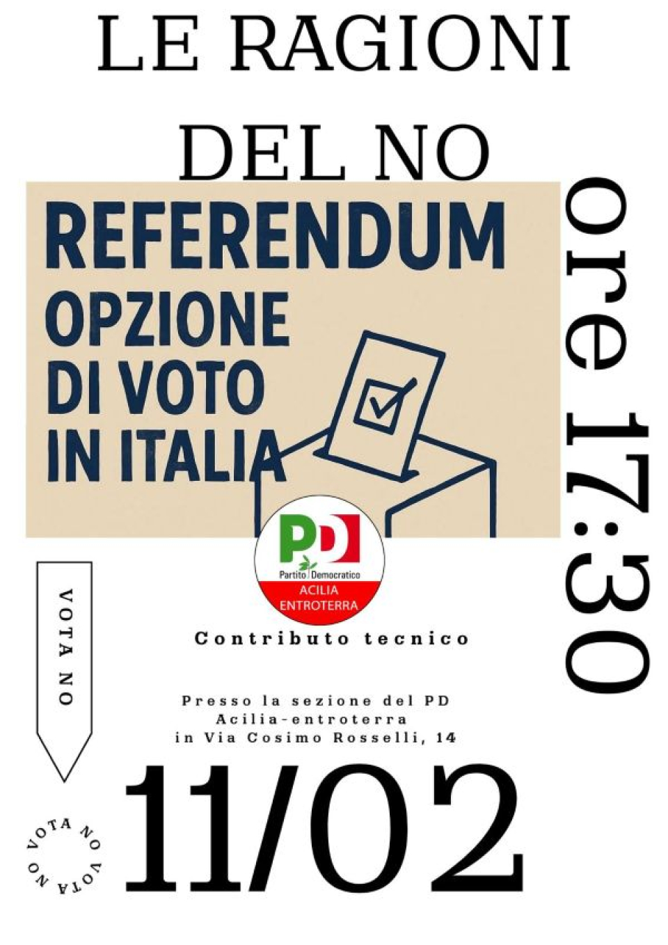 Acilia (Rm) – Informare prima di scegliere. E' questo l’obiettivo dell’incontro pubblico dedicato al Referendum sulla Giustizia, in programma mercoledì 11 febbraio alle ore 17.30 presso la sezione del Partito Democratico di Acilia, in via Cosimo Rosselli 14. Un appuntamento aperto alla cittadinanza per approfondire i contenuti del referendum e comprendere le motivazioni che spingono una parte del mondo politico e civile a schierarsi per il “no”.